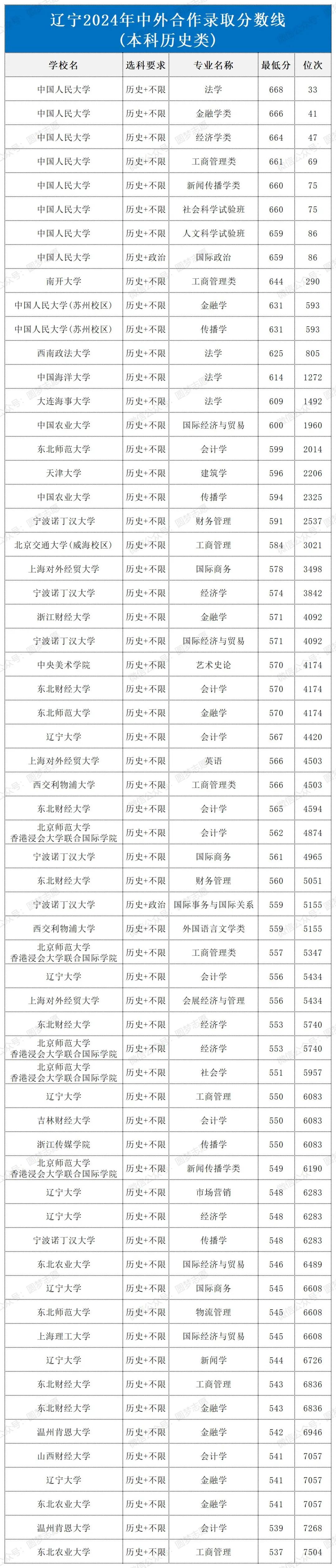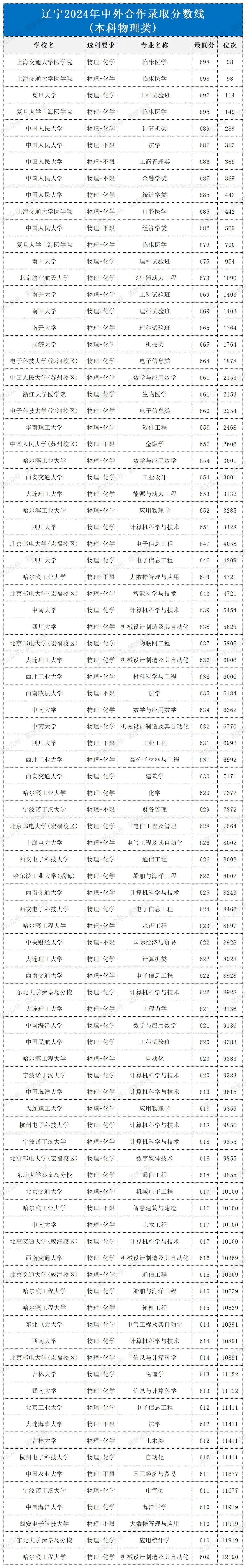 对于有意报考中外合作办学的学生而言,了解历年分数线走势、提前准备、提升综合素质至关重要。这些项目不仅考察学术能力,还关注学生的英语水平、国际视野以及跨文化交流能力。因此,考生需要在备考过程中全面提高自己,在激烈的竞争中脱颖而出。下面是辽宁2024年中外合作录取分数线,仅供参考。