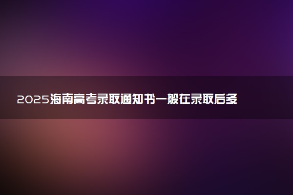 据海南省考试局发布的信息,2025年海南省普通高校招生录取工作预计7月9日开始至8月15日结束,高校一般会在录取结束后一周左右向录取新生寄发录取通知书。