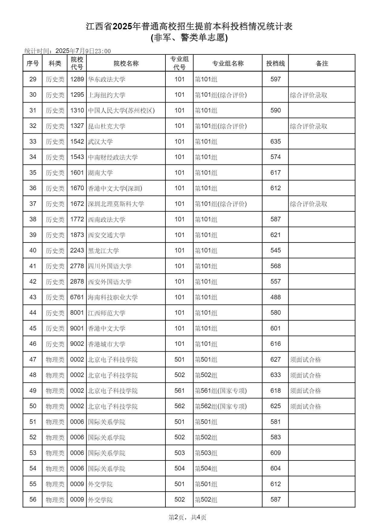 江西2025普通高校招生提前本科投档情况统计表(非军、警类单志愿)已公布,其中北京电子科技学院历史类专业组101投档线为629分,专业组102投档分621分;国际关系学院历史类专业组101,投档线586分,专业组102投档线580分,具体院校专业组投档线如下