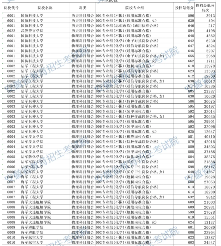 军队院校:22所军校在安徽招生938人,其中历史类10人,物理类928人。国防科技大学历史类招9人,最低投档线596分;物理类招78人,最低投档线642分。武警警官学院物理类投档线579分,为军校中最低。