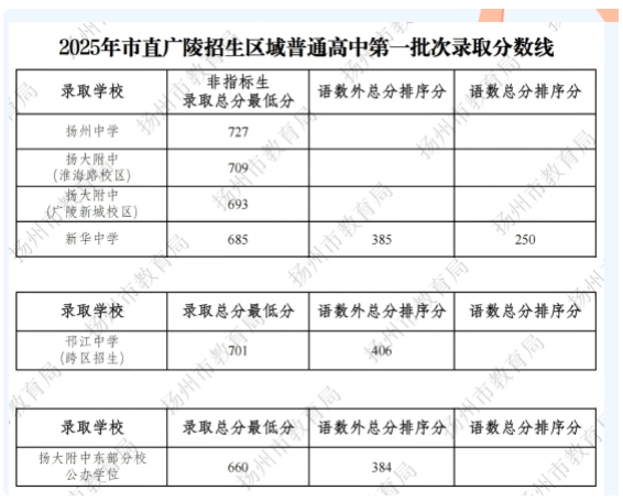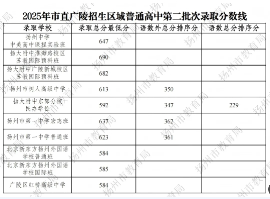 二、2025年市直广陵招生区域普通高中第一、二批次录取分数线