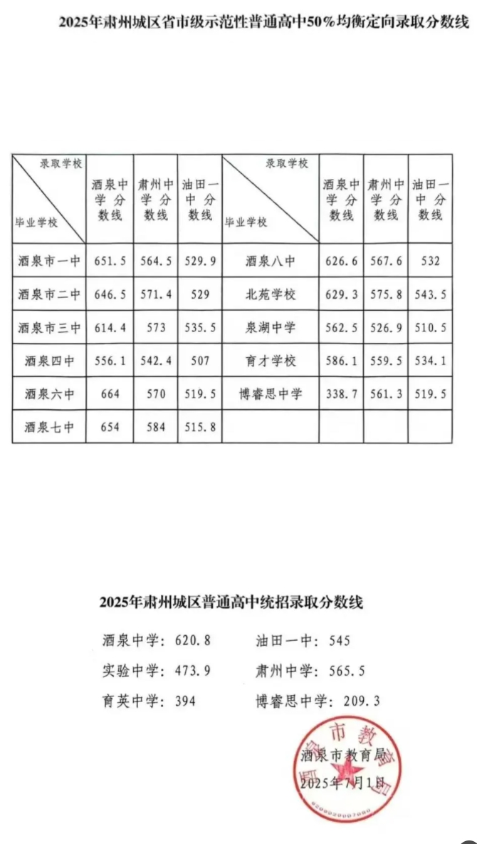 从酒泉发布获悉,2025年甘肃酒泉中考录取分数线已公布,其中包含肃州城区普通高中统招录取分数线和敦煌市2025年普通高中普通生录取分数线。具体详情小编整理如下: