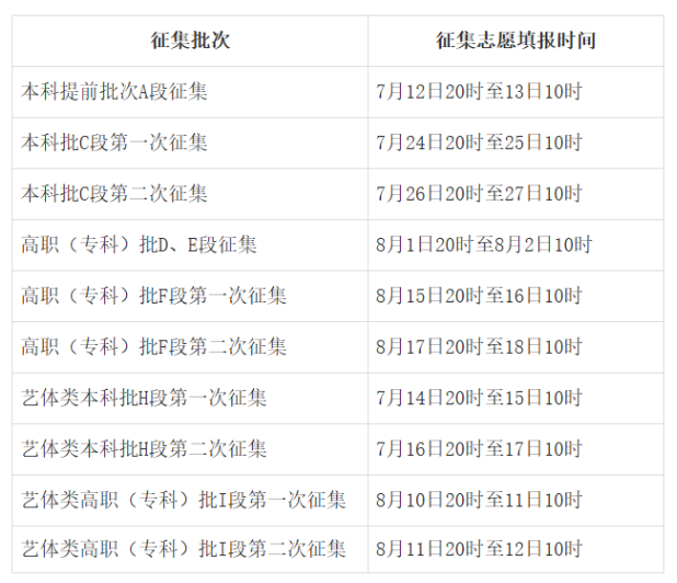 本科提前批次A段征集,征集志愿填报时间:7月12日20时至13日10时;