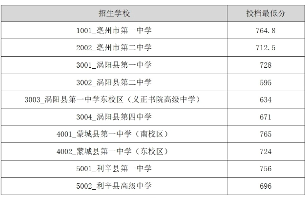 亳州市中招领导小组办公室公布了省示范高中统招投档最低分和市示范高中、一般高中和民办高中统招投档最低分。