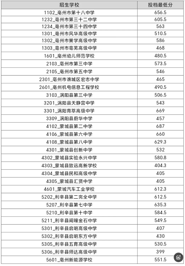 从亳州市教育局了解到,2025年安徽亳州市高中统招投档最低分数线已公布,其中亳州市第一中学投档最低分为764.8分;亳州市第二中学投档最低分为712.5分。具体详情小编整理如下: