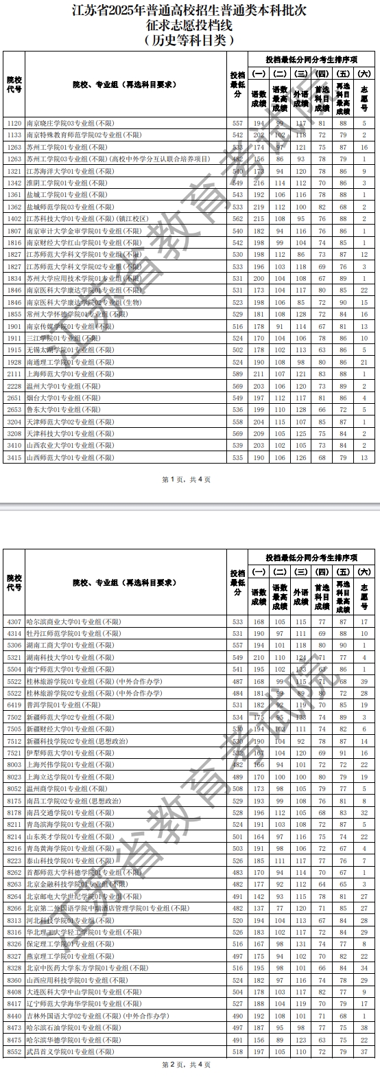 江苏省2025年普通高校招生普通类本科批次征求志愿投档线(历史等科目类)如下: