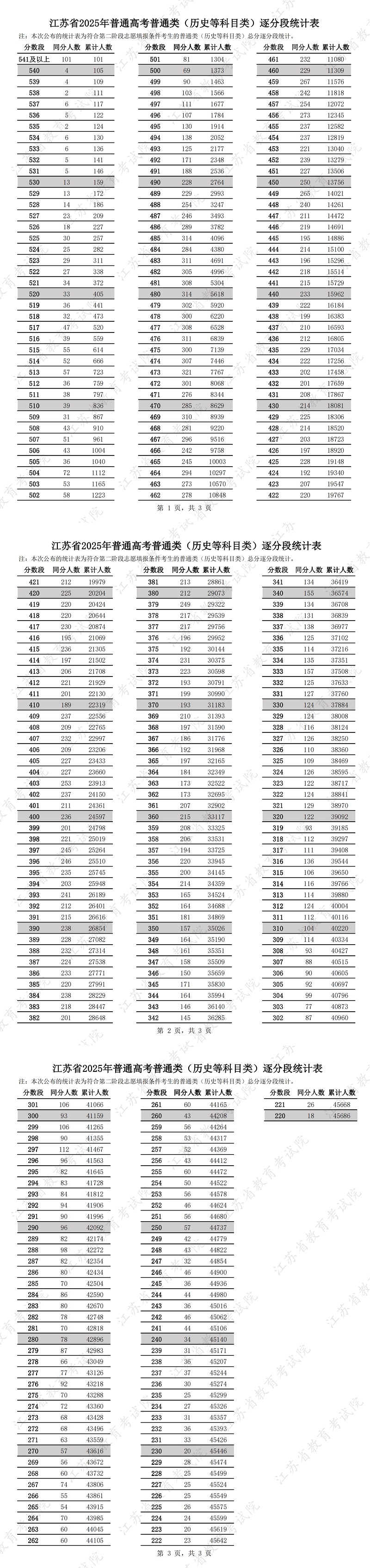 江苏省2025年普通高考普通类逐分段统计表(第二阶段)已经公布,其中历史类:541分及以上累计人数是101人;530分累计人数是159人;500分累计人数是1373人。物理类:575分及以上累计人数是102人;560分累计人数是162人。以下是详细内容,大家可以看一看。