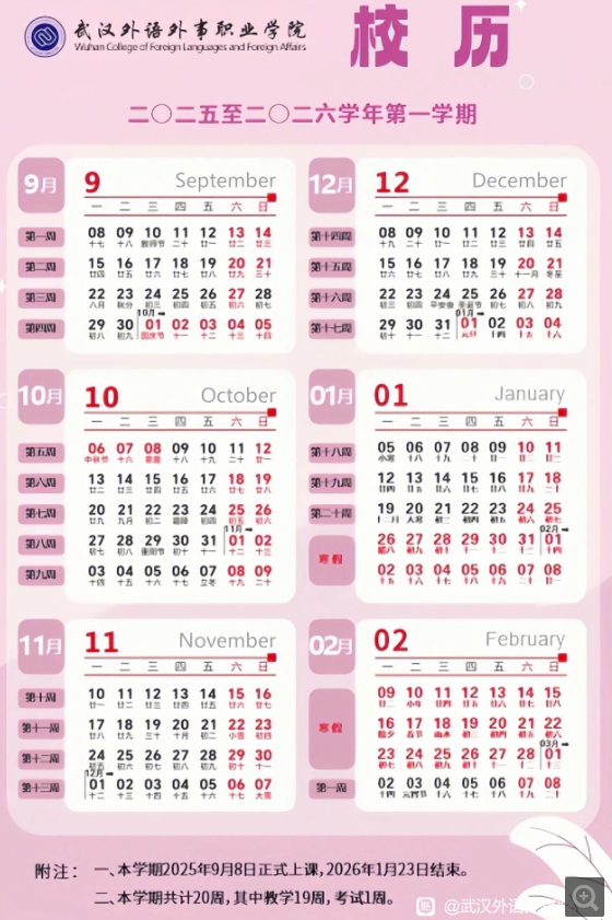 一到腊月,大学里就开始收拾东西准备放寒假啦!大多数学校都是1月下旬或二月初放假,到2月底、3月初再开学。放假期间,有的同学回家过年,有的留校搞科研、做实践。下面是2026武汉外语外事职业学院寒假时间及开学时间,如有调整,以学校最新通知为准。
